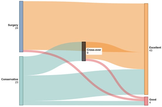 Sankey diagram illustrating patient flow between conservative management, surgical intervention, and cross-over (initially conservative patients who later underwent surgery). Final outcomes are classified using modified MacNab Criteria into “Excellent” and “Good” categories. Only patients with complete outcome data were included in the visualization. (Created with SankeyMatic).