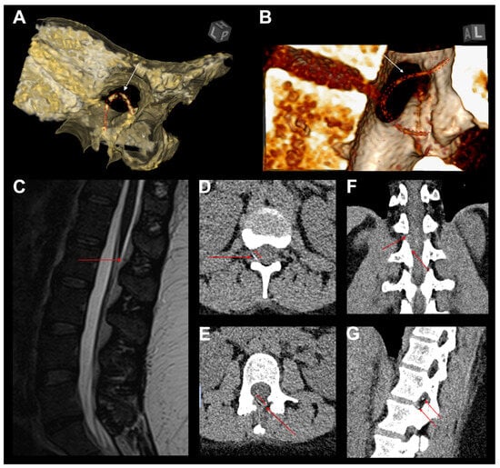 Illustrative case of catheter looping and consecutive breakage. (A,B) Three-dimensional CT reconstructions demonstrating a retained epidural catheter fragment (white arrows and red dashed line) with looping and entrapment at the interlaminar space, contributing to failed removal and subsequent breakage. (C) Sagittal T2-weighted MRI revealing the retained catheter fragment (red arrow) within the posterior epidural space, without evidence of significant spinal cord compression. (D,E) Axial CT images illustrating the fragmented catheter segment (red arrows) embedded in the epidural space, extending into the right neuroforaminal area. (F,G) Coronal and sagittal CT reconstructions confirming the catheter’s intralaminar positioning (red arrows), demonstrating intersegmental looping. The catheter follows a bi-segmental aberrant trajectory, which likely contributed to retrieval resistance and mechanical failure.