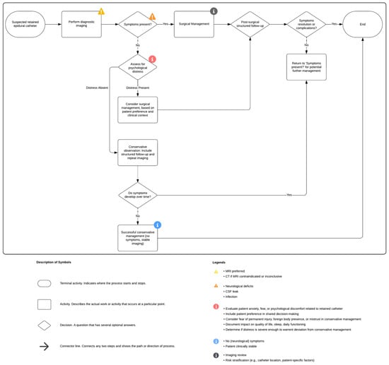 In asymptomatic patients, conservative management within a structured surveillance protocol remains appropriate. The follow-up should include periodic clinical evaluation and imaging, with annual intervals recommended as a baseline and shorter intervals based on individual risk. Clear criteria for re-evaluation, such as few symptoms, unresolved anxiety, or a change in patient preference, should be established. Figure 6 illustrates a structured clinical flowchart for the management of retained epidural catheter fragments.