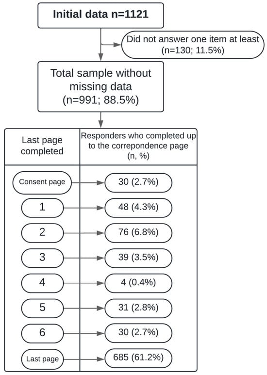 Due to the high number of missing data, an investigation was conducted to determine whether the lack of response was related to any potentially uncomfortable questions in the survey. Of the 7 pages in the questionnaire, 30 respondents did not progress past the informed consent page, 48 did not continue beyond the first page, and the remaining distribution is shown in the figure (Figure 1). No relationships were found between missing data and non-response to questions on the use of illicit drugs. No statistically significant differences were observed between participants’ sex, job position, contract type, or educational level in relation to the last page completed in the questionnaire (see Supplementary Material S3: “Study of ESCAUSA dropout points”).