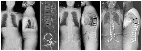 - Hiyama, A.; Sakai, D.; Katoh, H.; Sato, M.; Watanabe, M. Relationship Between Hounsfield Units of Upper Instrumented Vertebrae, Proximal Junctional Failure, and Global Alignment and Proportion Score in Female Patients with Adult Spinal Deformity. World Neurosurg. 2022, 164, e706–e717. [Google Scholar] [CrossRef] [PubMed]