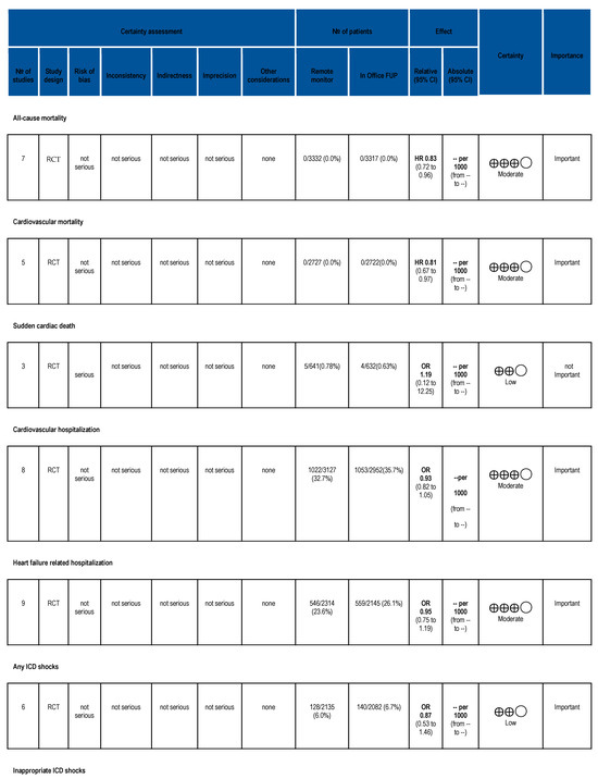 The following supporting information can be downloaded at https://www.mdpi.com/article/10.3390/jcm14124278/s1. Figure S1: Forest plot of sudden cardiac death; Figure S2: Revised Cochrane Risk-of-Bias Tool for randomized trials (RoB 2) in trials evaluating all-cause mortality; Figure S3: Revised Cochrane Risk-of-Bias Tool for randomized trials (RoB 2) in trials evaluating cardiovascular mortality; Figure S4. Revised Cochrane Risk-of-Bias Tool for randomized trials (RoB 2) in trials evaluating sudden cardiac death; Figure S5: Revised Cochrane Risk-of-Bias Tool for randomized trials (RoB 2) in trials evaluating cardiovascular hospitalization; Figure S6: Revised Cochrane Risk-of-Bias Tool for randomized trials (RoB 2) in trials evaluating heart failure hospitalization; Figure S7: Revised Cochrane Risk-of-Bias Tool for randomized trials (RoB 2) in trials evaluating any ICD shocks; Figure S8: Revised Cochrane Risk-of-Bias Tool for randomized trials (RoB 2) in trials evaluating inappropriate ICD shocks; Figure S9: PRISMA checklist; Figure S10: Forest plot of all-cause mortality for the subgroup analysis of daily and non-daily reporting on the RTM; Figure S11: Forest plot of all-cause mortality for the subgroup analysis of regularity of in-office visits (3,6,12 months) on the RTM; Figure S12: Forest plot of all-cause mortality for the sensitivity analysis based on Rob2 low and some concerns; Table S1: Additional information about the trials [42].