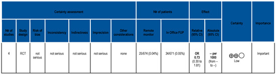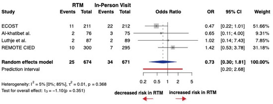 A total of four studies were selected for analyses, covering a total of 1345 patients. Three of the four studies did not report hazard ratios. The OR (the pooled effect size) was 0.73 between RTM and in-person visits. The 95% confidence interval of OR was 0.30 to 1.81, which means RTM did not have an effect on the rate of inappropriate therapy (p = 0.351) (Figure 8). These studies generally showed some concerns, particularly related to missing data and issues within the randomization process (Supplementary Materials Figure S8). These findings may be caused by the differences in alert action thresholds, follow-up protocols or patient selection.