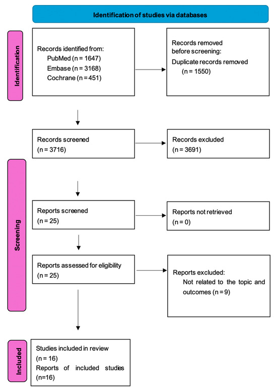 A systematic search was performed in three scientific databases—the Cochrane Central Register of Controlled Trials (CENTRAL), Embase and Medline (via PubMed)—for studies published up to 1 December 2024. The following search key was used in all databases: (remote monitor* OR home monitor OR telemonitor* OR “remote” OR “implantable hemodynamic monitor*”) AND (“implantable device” OR CIED OR implantable cardioverter defibrillator OR cardiac resynchronization therapy OR ICD OR CRT). No restrictions (year, language, etc.) were made.