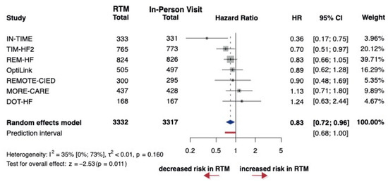 Forest plot of cardiovascular mortality. Hazard ratios (HRs) and 95% confidence intervals (CI) are shown for each study. The blue diamond represents the pooled HR, and the red bar shows the prediction interval. HR < 1 favors RTM [27,28].