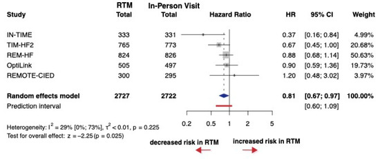 For cardiovascular mortality, 11 studies were identified comparing RTM to in-person visits; however, only 5 studies reported HRs, which were included in the analysis, encompassing a total of 5449 patients. The HR was 0.81 between RTM and in-person visits. The 95% CI of HR was 0.67 to 0.97, which represents a significant difference between RTM and in-person visits (p = 0.025) (Figure 4). The overall risk of bias varied slightly across studies, with most showing some concerns, particularly regarding the handling of missing data and the selection of reported outcomes. (Supplementary Materials Figure S3).
