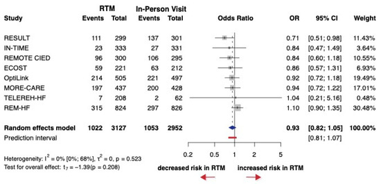 A total of nine studies, encompassing 4289 patients, were selected for analysis. Eight of the nine studies did not report HRs. The OR (the pooled effect size) was 0.95 between RTM and in-person visit groups. The 95% CI of OR was 0.75 to 1.2, clarifying that there was no significant difference in the effect of the two groups (p = 0.594) (Figure 6). The overall risk of bias for most studies was low, although some studies showed concerns primarily due to missing data, deviations from protocol or inconsistencies in reporting (Supplementary Materials Figure S6).