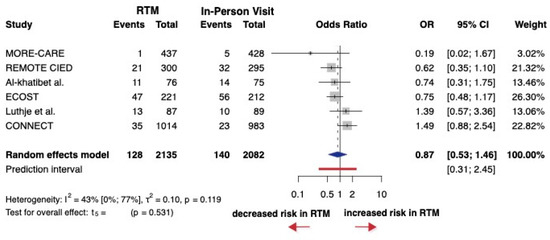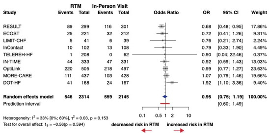 Forest plot of cardiovascular hospitalization. Odds ratios (ORs) and 95% confidence intervals (CI) are shown for each study. The blue diamond represents the pooled OR, and the red bar shows the prediction interval. OR < 1 favors RTM.