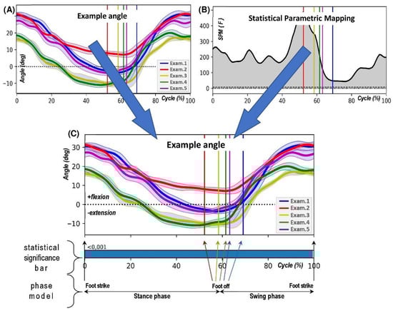 The methodology employed to generate a result chart for an example angle. Initially, the original graph presents the mean angle values, along with the standard deviation, for successive research periods from Exam.1 to Exam.5 (Panel A). This data is then subjected to a statistical process. The outcome of Statistical Parametric Mapping (SPM) computations is depicted in a chart that exhibits the statistical function’s value (Panel B). In the final step (Panel C), statistical information is superimposed onto the angle graph as a statistical significance bar. The resulting chart also includes details about the gait phases. The length of the stance phase (from foot strike to foot off) differs across the research periods and is indicated by vertical, coloured lines. Each line’s colour corresponds to the angle trajectory’s colour for that specific research period, as described in the legend.