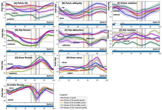 The SPM{t} analysis for the defined angles across consecutive examination periods—preoperative (Exam.1), 6 weeks postoperative (Exam.2), 3 months postoperatively (Exam.3), 6 months postoperatively (Exam.4), and 12 months postoperatively (Exam.5)—revealed significant alterations in joint kinematics throughout the gait cycle. Explicitly, significant changes in pelvic tilt were observed around 60% of the gait cycle, where the SPM{t} test indicated a p-value < 0.001. Pelvic obliquity demonstrated notable differences primarily in the mid-cycle phase, underscored by significant p-values (<0.001). Changes in pelvic rotation were identified at around 60% and 80% of the gait cycle, suggesting substantial modifications in postural control following THR.