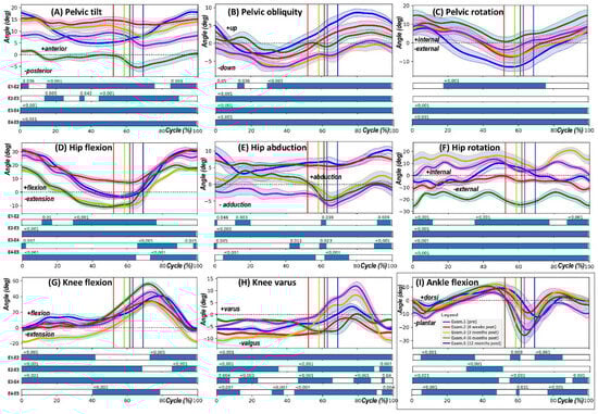 The results of the significance analysis of differences in angular kinematics between successive measurement periods are depicted in Figure 2. The horizontal bars in each subfigure denote the specific points within the gait cycle where the SPM{F} test statistics cross the threshold for significance, illustrating the comparative overall differences in joint kinematics between the various examination periods.