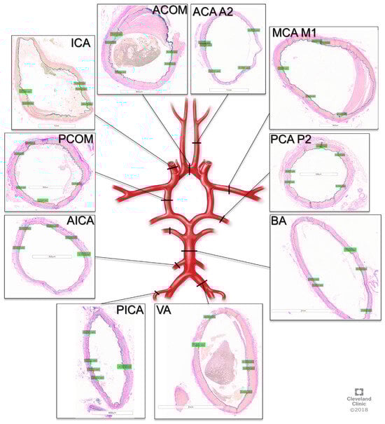 Specimens were obtained from each specified location within the vascular territories: internal cerebral artery (ICA), anterior cerebral artery (A1, A2, A3), middle cerebral artery (MCA) (M1, M2, M3, M4), posterior cerebral artery (P1, P2), superior cerebellar artery, anterior inferior cerebellar artery (AICA), posterior inferior cerebellar artery (PICA), vertebral, basilar, and anterior communicating (ACOM) and Posterior Communicating (PCOM) vessels, as summarized in Table 2. Tissue was immediately stored in 10% formalin specimen containers.