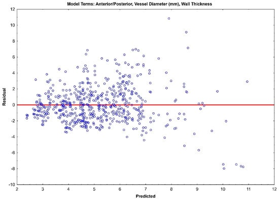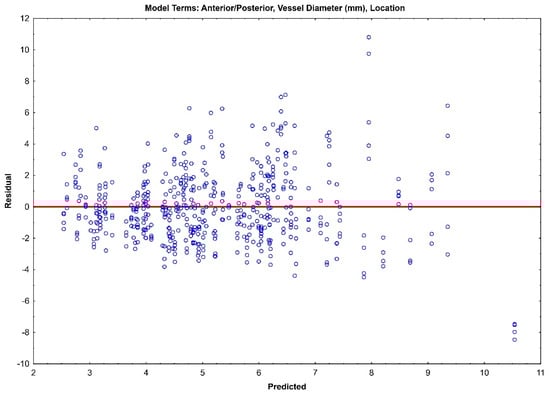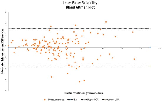 Analysis was performed on the obtained measures of elastin thickness and vessel wall thickness (defined as intima through adventitia for one side of a vessel diameter of obtained samples that were intact). Also taken into account were the vessel diameter, anterior vs. posterior, and right vs. left lateralities as class variables to examine whether these affected the measured differences in elastin thickness. Inter-rater reliability was evaluated for bias and is demonstrated using a Bland–Altman plot (Figure 2). Multivariable analysis using a mixed-models repeated measures regression method was then performed on the dataset to examine the statistical significance of the anterior/posterior differences against combinations of vessel diameter, wall thickness, and elastin thickness. Specifically, comparisons of (1) elastin thickness versus vessel diameter and anterior/posterior circulation, (2) elastin versus vessel wall thickness and anterior/posterior circulation, (3) vessel wall thickness versus diameter of vessel and anterior/posterior circulation, and (4) elastin thickness alone and anterior/posterior circulation were all tested, with significance being defined as a p value < 0.05. All analyses were performed using SAS version 9.4 by biostatistician author RB.