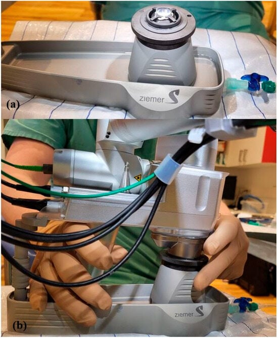 Experimental setup: (a) the cornea clamped in the artificial anterior chamber (b) with subsequent docking of the second handpiece to the laser arm.