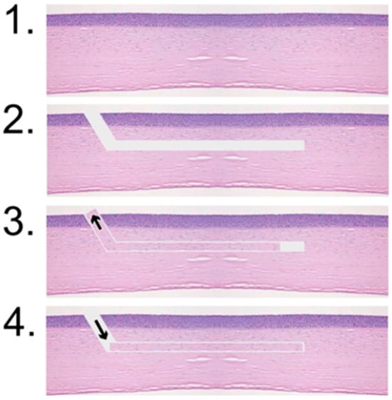 The trephination thickness of the donor Bowman layer was set to the thinnest possible option, and the depth of the recipient pocket oriented to the physiological position of the Bowman layer was as shallow as possible without leaving an uncut area. These parameters were based on previous studies conducted by Van Dijk et al., who performed these procedures using the LDV Z6 []. The successfully prepared Bowman layers were inserted into the corresponding corneal pockets, as schematically shown in Figure 3. A Bowman layer preparation was considered successful if it was present as a free flap directly after the laser procedure or if adhesions could be loosened and no perforation occurred.