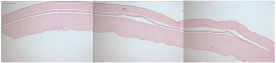 Histological analysis revealed smooth, precisely cut edges of the Bowman layers and pockets, as shown in Figure 4. Due to the shrinkage artifacts caused by kerosene embedding and the subsequent staining process, no exact correlation could be established between the values set during preparation and the histopathological sections.