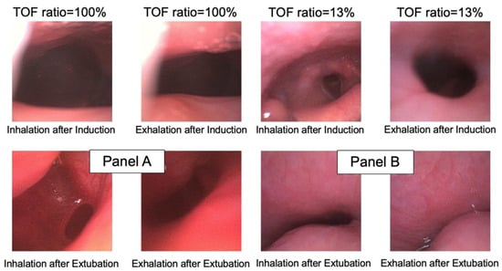 Demonstrative cases of retroglossal area during inhalation and exhalation after induction (baseline) and after tracheal extubation. Panel (A) is from a patient with a train-of-four ratio = 1.0 (100%); panel (B) is from a patient with a train-of-four ratio = 0.13 (13%). TOF: train-of-four.
