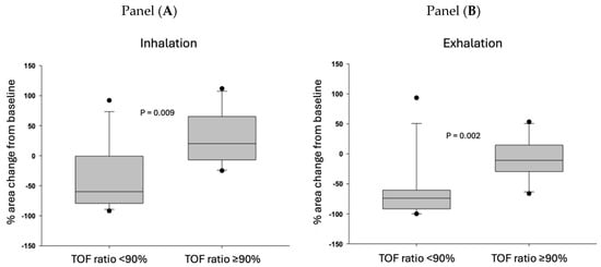 Percent change in the upper airway compared to the baseline upper airway cross-sectional areas during inhalation (Panel (A)) and exhalation (Panel (B)). Patients are grouped based on the train-of-four ratio measured immediately after extubation. The threshold of neuromuscular recovery is defined as a train-of-four ratio ≥ 0.90. Medians and 25–75% interquartile ranges are presented. The horizontal middle line represents the median, the grey boxes represent the 25–75% confidence intervals, the “error bars” represent minimum and maximum values, and the dots represent outliers.