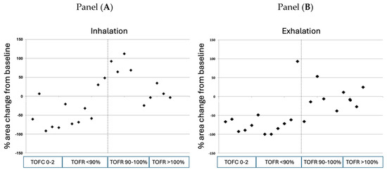 Individual measurements of retroglossal area during inhalation (Panel (A)) and exhalation (Panel (B)) immediately after tracheal extubation as a function of the degree of neuromuscular recovery. The dotted line represents the threshold of neuromuscular recovery, defined as a train-of-four ratio > 0.90. TOFC: train-of-four count; TOFR: train-of-four ratio.