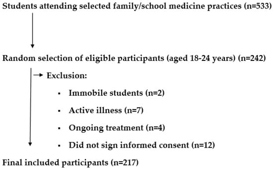 A cross-sectional study was conducted from September 2024 to March 2025, involving 217 students from 16 faculties at the University of Rijeka. The study was conducted in five family medicine practices and three school medicine practices in Croatia. Students who visited the selected family and school medicine practices were included in the study through random selection. The inclusion criteria were students at the University of Rijeka aged 18–24 years. The exclusion criteria were students who were immobile or had an active illness, fever, or treatment in progress.