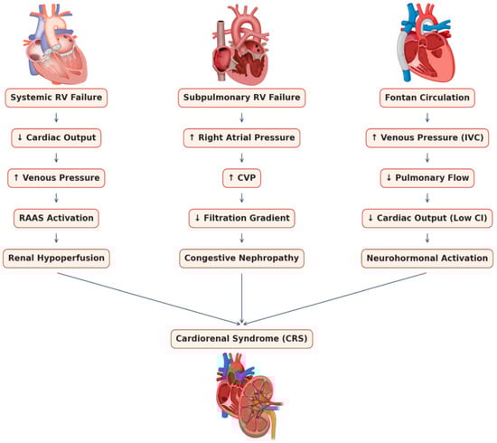 Pathophysiology: The failing systemic RV mimics many aspects of left ventricular failure. As the RV’s ejection fraction declines, forward cardiac output to the kidneys drops, activating the renin–angiotensin–aldosterone system (RAAS) and sympathetic nervous system []. Neurohormonal activation leads to sodium and water retention, resulting in worsening volume overload. Simultaneously, elevated systemic venous pressure from RV failure can cause hepatic and renal venous congestion [,]. However, the hemodynamics can be complex. In atrial-switch TGA, a failing systemic right ventricle causes elevated pulmonary venous pressures, as pulmonary venous return is directed to the systemic RV through the atrial baffle. This leads to pulmonary edema and congestive symptoms similar to left heart failure. In ccTGA without prior repair, systemic RV failure tends to cause systemic venous congestion (ascites, peripheral edema) due to elevated left atrial pressure, which is connected to the failing morphologic RV, while the pulmonary circulation is protected by the morphologic LV. In both scenarios, renal perfusion pressure is compromised by low forward output and possibly by hypotension, while congestion raises renal interstitial pressure—a combination that reduces GFR. Over time, chronic hypoperfusion triggers glomerulosclerosis and impairs the kidney’s adaptive capacity.