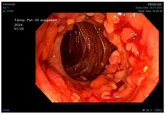 Outpatient chest X-ray showed findings suggestive of pulmonary infection. Laboratory results revealed microcytic anemia with suspected iron deficiency. Sputum microscopy and PCR confirmed Mycobacterium tuberculosis. Given the patient’s abdominal pain and a finding of melena in a setting of known CD, colonoscopy was performed. During the procedure, we saw numerous pseudopolyps and fibrin-coated ulcerations (Figure 4) in the cecum and colon ascendens et transversum, which are consistent with both CD and GI TB. Histopathology showed severe ulcerative and granulomatous inflammation (Figure 5) but was not able to distinguish between the two conditions. Only after subsequent PCR testing demonstrated M. tuberculosis DNA did we confirm that the active infection had caused this severe form of colitis.