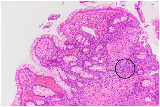 Histopathologic sample of colon showing severe inflammatory infiltrate (circle), prompting further testing to determine the cause of the colitis.