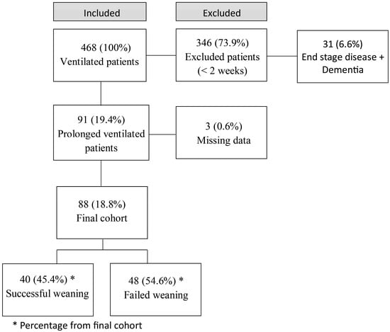 - Magnet, F.S.; Bleichroth, H.; Huttmann, S.E.; Callegari, J.; Schwarz, S.B.; Schmoor, C.; Windisch, W.; Storre, J.H. Clinical evidence for respiratory insufficiency type II predicts weaning failure in long-term ventilated, tracheotomised patients: A retrospective analysis. J. Intensive Care. 2018, 6, 67. [Google Scholar] [CrossRef]