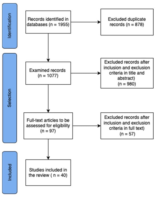 Out of the initial 1955 articles identified through the search, 40 studies were selected to the review (Figure 1).