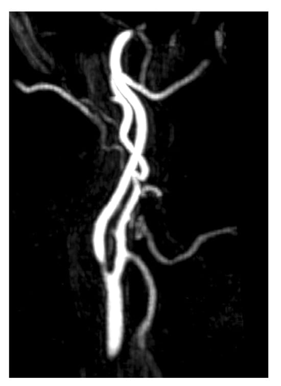 MRA imaging of vascular stenosis due to atherosclerosis in a 72-year-old female patient with cardiovascular risk factors. She presented with PT in the right ear, synchronous with her pulse. Compression of the right carotid artery reduced the perception of the tinnitus. Sagital-MIP MRA revealed atheromatous plaques in both carotid bifurcations, with no significant stenosis on the left side. However, on the right side, there was short segmental stenosis, with a caliber reduction of over 70%. Revascularization was performed by the angiology team, resulting in the resolution of the PT.