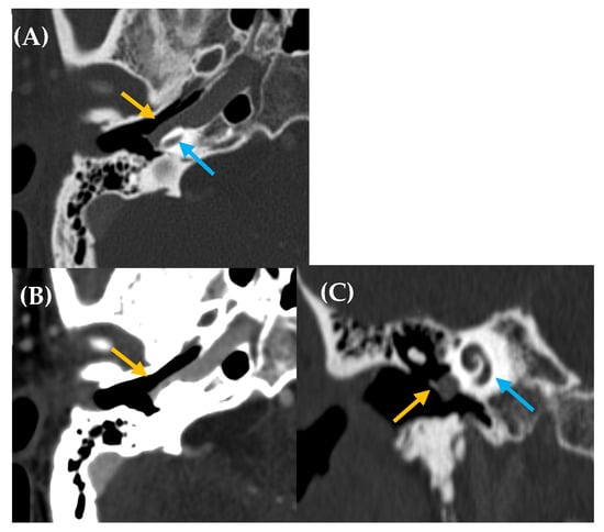 Aberrant intratympanic course of the right internal carotid artery, which is in contact with the cochlea (yellow arrow: aberrant ICA; blue arrow: cochlea). A 33-year-old man with right-sided PT of several years’ duration. Otoscopy revealed a pulsatile tumor in the right ear. CT imaging (A), axial plane bone window; (B), axial plane, contrast enhanced with soft tissue window; and (C), MPR coronal plane reconstruction) demonstrated a space-occupying lesion with a tubular appearance in the right mesotympanum, adjacent to the cochlear promontory, along with an enlarged inferior tympanic canaliculus and absence of the carotidotympanic bone septum.