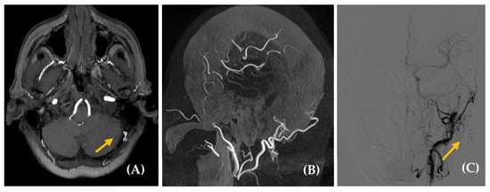 Arteriovenous malformations (AVMs) consist of clusters of vessels with numerous interconnections. Similarly to dAVFs, AVMs located in the transverse and sigmoid sinuses can often cause PT [22]. They differ from dAVFs in that AVMs are lesions with an intra-axial vascular nidus, receiving arterial supply from pial arteries, without an identifiable capillary bed. Their diagnosis is typically made using MRA (Figure 6) and DSA, which are also used for prognosis assessment and treatment planning. The presence of vascular tangles on DSA is pathognomonic for AVMs, whereas associated flow or intranidal aneurysms and a pattern of diffuse leptomeningeal venous prominence, known as a pseudophlebitic pattern, are considered poor prognostic factors. The treatment is either endovascular or surgical in nature.