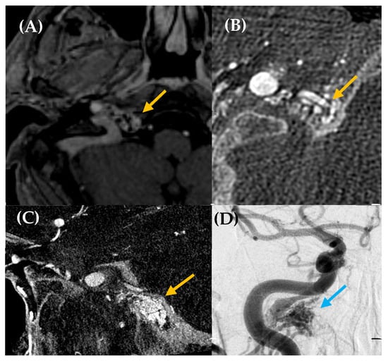 Carotid–cavernous fistulas (CCFs) are abnormal communications between the carotid artery and the cavernous sinus, either directly or through intradural branches of the ICA or ECA. Their etiology can be spontaneous (congenital, degenerative, or infectious), but the majority are believed to have a traumatic origin [61]. They can be classified according to Barrow et al. into direct (Type A) and indirect (Type B-C-D) types [62]. The most appropriate management for CCFs with moderate clinical symptoms and without angiographic findings indicating poor prognosis should be conservative. However, in patients for whom conservative treatment has not been effective or who show signs of poor prognosis, endovascular treatment will be performed [63,64].