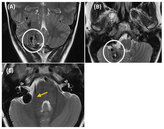 T2-weighted MRI showing a right cerebellar arteriovenous malformation (AVM) in a 44-year-old woman presented with somatosound, instability, and a sensation of pressure in the right hemiface. Coronal (image (A)) and axial (image (B,C)) MRI revealed a right cerebellar AVM, with a capillary nidus measuring 23 × 20 × 19 mm (outlined by a white circle in images (A,B)). The AVM showed multiple draining veins towards the anterior petrosal sinus and voluminous varicose venous dilatation (yellow arrow in image (C)) adjacent to the posterior border of the IAC. Given the size, location, and characteristics of the AVM, the decision was made to treat the patient using radiosurgery with Gamma Knife. This technique targets the abnormal vessels, promoting gradual occlusion of the AVM while minimizing damage to surrounding brain tissue.