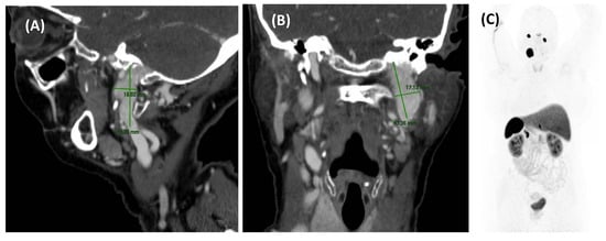 In patients with suspected atherosclerotic PT, neck auscultation may reveal a “murmur”-like bruit, which may change with head rotation or extension. Significant stenosis in a cervical vessel can be detected using CTA, MRA, or Doppler ultrasound [22], though the latter is not typically a first-line diagnostic test for arterial PT. Doppler ultrasound is not indicated because stenosis below the carotid bifurcation seldom causes PT, and for carotid stenosis to lead to PT, it must be significant (>70%) [12,34]. Given these considerations, MRI combined with MRA is the recommended imaging modality when vascular stenosis is suspected. In some cases, large cervical tumors may compress major cervical vessels, such as the carotid artery, resulting in stenosis and turbulent blood flow, which can cause PT. In such patients, a CT scan may be requested before an MRI to identify the cause of the vascular compression.