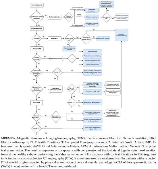 In the diagnostic evaluation of PT, it is essential to emphasize a detailed clinical history. First, it is important to confirm that the sound is synchronous with the heartbeat and increases with physical activity, as these features typically indicate a vascular etiology. In contrast, asynchronous PT is often related to a mechanical cause, such as palatal or middle ear myoclonus. The onset pattern of PT is also informative: a sudden onset may suggest conditions like hypertensive crises, vascular anomalies (e.g., aneurysms, fistulas, carotid dissections), or vascular compression by a cervical mass. Insidious onset is more common in cases of idiopathic intracranial hypertension (IIH) or anemia. The sound tone can provide further diagnostic clues. A low-frequency sound (e.g., a “buzz” or “murmur”) is often venous in origin, while a high-frequency sound (e.g., a “whistle” or “hiss”) is typically arterial [26]. Past medical history is another critical element, as conditions such as hypertension, hyperthyroidism, anemia, pregnancy, and medication changes (e.g., enalapril or verapamil [27]) may contribute to PT. Other factors, such as traumatic brain injury (TBI), may suggest an arteriovenous fistula, weight gain could point to IIH, and recent cervical manipulation might indicate arterial dissection. Family history should also be considered, particularly regarding vascular malformations or otosclerosis. Associated symptoms are key in narrowing down the diagnosis. Auditory symptoms, such as hearing loss or ear fullness, may suggest conductive hearing loss from otitis media with effusion, a middle ear mass, or an inner ear disorder. Autophony, ear fullness, or sound-induced vertigo may indicate superior canal dehiscence syndrome (SCDS). Headaches, particularly hemicranial, or visual disturbances could suggest a migraine with brainstem aura (which can trigger PT during the aura phase or due to vasodilation during the headache) [28] or IIH [22]. Finally, it is essential to assess the severity of PT, including factors that exacerbate or relieve the condition, as well as the impact on the patient’s quality of life, to guide appropriate management.