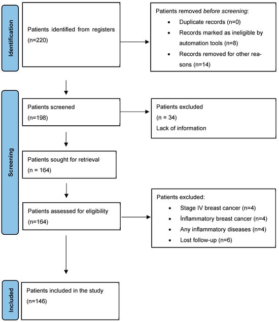 In the sample size analysis where type 1 error was accepted as 0.05, power was 90%, and effect size was d = 0.85, the minimum sample size to be reached was found to be 140. Since there was no study to refer to in the literature, the effect size was accepted as medium effect size (0.5) according to Cohen’s guidelines. A total of 220 early-stage breast cancer patients applied to the two participating centers during the study period. Among them, 8 were excluded by automated eligibility tools (e.g., duplicates, incomplete identifiers), and 14 were excluded due to administrative or technical issues (e.g., missing baseline data, unavailable lab results), resulting in 198 patients eligible for formal screening. Of these, 34 patients were excluded due to lack of medical information, and an additional 18 patients were excluded for clinical reasons (e.g., inflammatory breast cancer, metastatic disease, loss to follow-up, or concurrent inflammatory conditions). Consequently, 146 patients who satisfied all qualifying criteria were incorporated into the final study (Figure 1).
