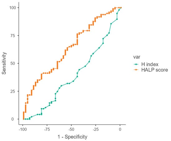The cut-off value was determined by receiver operating characteristics (ROC) analysis. The cut-off was found to be 36 (AUC = 0.608) for the HALP score and 2.3 (AUC = 0.641, p < 0.001) for the H index (Figure 2).