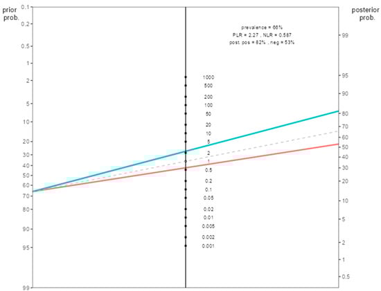 When the post-test probability rates were calculated for the combined response score group in the Fagan nomogram, the post-test probability of pathologic response was 81.5% in patients with a combined response score of 2. In other words, while the pretest probability of pathologic response was 66%, our post-test probability was 81.5%. For this patient group, our initial prediction for pathologic response for the low-H index < 2.3 and the high-HALP ≥ 36 patient group increases from 66% to 82% (Figure 3).