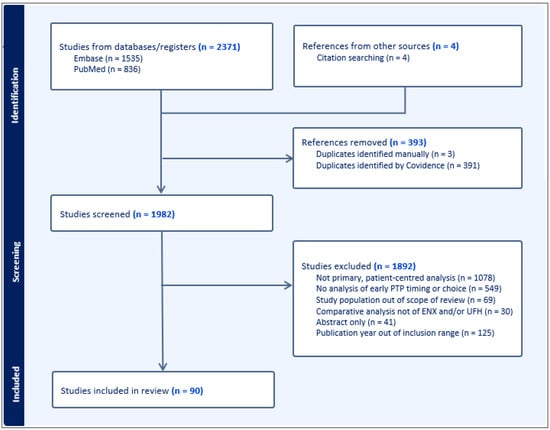 The literature search yielded a combined 2371 records, of which 1982 remained after removing 393 duplicates (Figure 1). We included 90 articles for the review (Figure 1), totaling 669,725 patients included in relevant analyses with injuries of interest. Of these studies, 9 were prospective, randomized studies, and 8 were prospective, observational studies. The remaining 73 studies were retrospective, observational studies, of which 51 utilized either propensity score matching and/or multivariate regression analyses to account for presumed confounding variables to assess the independent association of an exposure and outcomes of interest. These statistical methods varied significantly, particularly in the chosen variables incorporated into multivariate analyses. Even after categorizing and reviewing these studies by included injury/diagnosis type, significant variance was evident in the timing of PTP initiation (as well as the definition of delayed and early PTP), choice or comparison of agents, dosing, and the severity of initial injury, among other baseline demographics, as well as the level of reporting of this information. These studies largely focused on the utilization of UFH and/or ENX, though some analyzed the use of LMWH without further characterization of the agent, or LMWH as mostly represented by ENX, with a minority utilization of alternative LMWH agents (i.e., dalteparin). The demographic data reported in this review reflects the matched populations where applicable, to best represent the populations for which matched cohort-adjusted results were presented in the literature. All the included studies are summarized in the supplementary excel file, with prospective studies separated from retrospective analyses to facilitate study navigation by design.