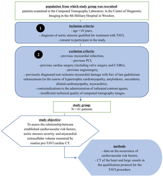 Flowchart of patient selection and study design. Patients with severe aortic stenosis who were qualified for transcatheter aortic valve implantation (TAVI) were enrolled in the CT Laboratory of the 4th Military Hospital in Wrocław. Inclusion and exclusion criteria are listed. The study group consisted of 61 patients. The objective was to assess the relationship between cardiovascular risk factors, aortic stenosis severity, and myocardial extracellular volume (ECV) measured by pre-procedural cardiac CT. Data were obtained from routine cardiovascular risk assessment and computed tomography scans performed as part of the TAVI qualification protocol. Abbreviations: CABG, coronary artery bypass grafting; CT, computed tomography; PCI, percutaneous coronary intervention; TAVI, transcatheter aortic valve implantation.