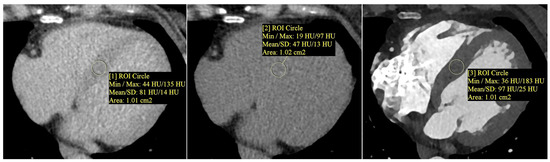 Measurement of myocardial and blood pool attenuation (Hounsfield units, HU) was performed by placing circular regions of interest (ROIs, about 1.0 cm2) on native and delayed-phase cardiac CT images to quantify extracellular volume (ECV). From left to right: native (non-contrast) myocardium—ROI [1]; delayed-phase myocardium—ROI [2]; delayed-phase blood pool—ROI [3]. ROIs were positioned to avoid trabeculae, epicardial fat, and calcifications. Mean HU values ± SD are displayed. ECV was calculated using a standard formula that incorporates the patient’s hematocrit and the attenuation difference between the myocardium and blood pool. Note: ROI numbers [1], [2], and [3] refer to the image annotations and do not indicate literature references.