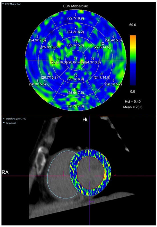 Myocardial extracellular volume (ECV) was calculated semi-automatically using the CT Cardiac Functional Analysis post-processing application (module version 3.0.1, running on syngo.via platform version VB60B_HF02; Siemens Healthineers AG, Forchheim, Germany)—Figure 2. The calculation was based on native and delayed phase images, and an ECV map of the left ventricle was generated, divided into 17 standard myocardial segments (LV). The final ECV value used for analysis represented the mean of all 17 segments (global myocardial ECV)—Figure 3.