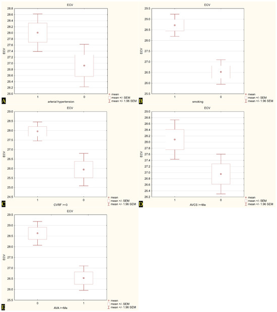 Extracellular volume (ECV) values in relation to selected cardiovascular risk factors and calcium scores. (A) ECV in patients with (1) and without (0) arterial hypertension; (B) ECV in smokers (1) and non-smokers (0); (C) ECV in subjects with ≥3 cardiovascular risk factors (CVRF) (1) vs. <3 CVRF (0); (D) ECV in patients with aortic valve calcium score (AVCS) ≥ median (1) vs. <median (0); (E) ECV in patients with aortic valve area (AVA) < median (0) vs. ≥median (1). Mean values are presented with standard error of the mean (±SEM) and 95% confidence intervals (±1.96 SEM).