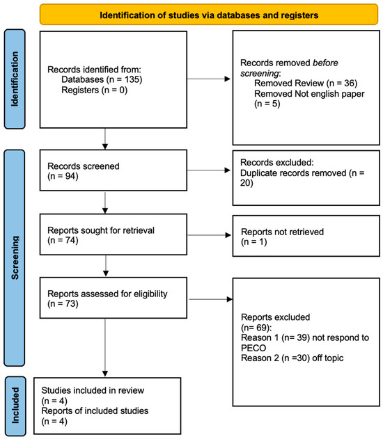 A total of 135 studies were identified through searches conducted across three databases. During the initial phase, 20 duplicate records were removed, and 5 studies were excluded, as they were not written in English. In the first screening step, 36 articles were discarded because they were systematic reviews and did not align with the inclusion criteria. Additionally, only randomized clinical trials were considered by applying a specific filter. In the final stage, 73 articles underwent evaluation, including both abstract and full-text reviews. Out of these, only 4 studies were selected for the systematic review, as depicted in the PRISMA 2020 flowchart (Figure 1). The remaining 69 studies were excluded, with 39 failing to meet the PECO criteria and 30 being irrelevant to the topic. Titles and abstracts were screened according to the PECO framework, resulting in 4 articles being deemed eligible and included in the final review from the databases searched.