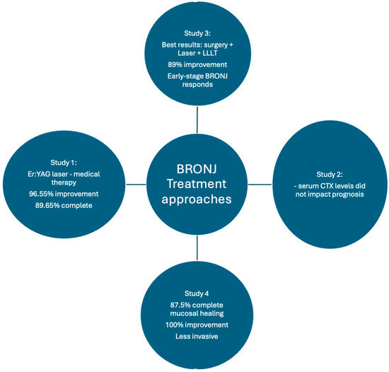 The study of Vescovi et al. (2010) [54] involved a cohort of patients who underwent various interventions, including surgical debridement and laser-assisted techniques, specifically utilizing Er:YAG lasers. The findings indicate that laser-assisted treatments significantly improved healing outcomes compared to conventional surgical methods. Specifically, the study reported a complete mucosal healing rate of 87.5% among patients treated with laser techniques, with many patients transitioning from higher stages of BRONJ to lower stages post-treatment. Statistical analyses demonstrated that the use of Er:YAG lasers, in conjunction with LLLT, resulted in a significant improvement in the healing of necrotic bone sites (p < 0.0001) [54]. The second study was by Vescovi et al. (2012) [55]. The patients were grouped into four categories based on the treatment they received: Group 1 (G1) included those treated with antibiotics only; Group 2 (G2) involved patients treated with antibiotics and LLLT; Group 3 (G3) received antibiotics and surgical treatment; and Group 4 (G4) received antibiotics, surgical treatment, and LLLT. Treatments were performed at the Unit of Oral Pathology and Medicine and Laser-Assisted Surgery of the University of Parma between January 2004 and July 2009. BRONJ sites were classified according to the American Association of Oral and Maxillofacial Surgeons’ staging system. Various factors, including additional risk factors such as smoking, diabetes, and corticosteroid use, were uniformly distributed across the groups. Antibiotic treatment involved amoxicillin and metronidazole, while LLLT was performed using a Nd:YAG laser. Surgical interventions varied based on lesion severity, involving mucoperiosteal flap elevation and bone removal via conventional burs or an Er:YAG laser. The efficacy of treatments was assessed by clinical improvement, defined as the transition to a lower BRONJ stage for at least six months. The results of the study showed that clinical improvement varied across the different treatment groups. In Group 1 (G1), which received only antibiotic therapy, 25% of the BRONJ sites (3 out of 12) showed improvement, with 16.6% reaching complete mucosal healing (stage 0). Group 2 (G2), which received antibiotics combined with LLLT, had 66.6% of the sites (18 out of 27) showing improvement, with 33.3% achieving stage 0. Group 3 (G3), which involved antibiotics and surgical therapy, showed improvement in 52.9% of the sites (9 out of 17), all of which reached stage 0. The highest improvement rate was observed in Group 4 (G4), which combined antibiotics, surgical therapy, and LLLT. In this group, 88.8% of the sites (40 out of 45) improved, and 73.3% achieved complete healing (stage 0). Statistically significant differences were found between the outcomes of G1 and G2 (p = 0.0346), as well as between G4 and the other groups (p < 0.05). A comparison of medical (G1 + G2) versus surgical (G3 + G4) approaches showed that surgical treatments had better outcomes in terms of complete healing and clinical improvement. Additionally, laser-assisted treatments (G2 + G4) had higher clinical improvement rates than non-laser-assisted treatments (G1 + G3) (p = 0.0003). The location of the lesions (mandible or maxilla) and the underlying pathology (multiple myeloma, bone metastasis, or osteoporosis) did not significantly affect treatment outcomes [55]. The study of Vescovi et al. (2012) [56] evaluated 151 patients (110 women and 41 men) with a mean age of 67.3 and 66 years, respectively, who were diagnosed with bisphosphonate-related osteonecrosis of the jaw (BRONJ). The patients were treated at the University of Parma, Italy, from January 2004 to July 2010. Out of 192 affected bone sites, 139 were treated using different methods. The study population included patients treated with bisphosphonates (BPs) for multiple myeloma, bone metastasis, and osteoporosis. Treatment modalities were classified into five groups based on different combinations of medical therapy, LLLT, conventional surgical therapy, and laser-assisted surgery using an Er:YAG laser. The medical therapy regimen included antibiotics and antiseptic mouth rinses. LLLT was applied weekly for two months, while surgical procedures ranged from conservative debridement to laser vaporization of necrotic bone. Treatment outcomes were assessed through clinical examinations and statistical analysis of factors like BRONJ stage and primary disease. The results revealed significant differences in clinical improvement and healing across treatment groups. Clinical improvement was highest in the group treated with Er:YAG laser surgery and LLLT (96.55%), followed by medical and conventional surgical therapy combined with LLLT (81.81%), and medical therapy alone showed the lowest improvement (25%). Complete healing rates followed a similar trend, with the highest healing observed in the Er:YAG laser group (89.65%). Statistical analysis showed no correlation between primary disease and treatment response, but a significant correlation was found between BRONJ stage and treatment responsiveness. Early-stage BRONJ responded better to treatments, and surgical approaches, particularly laser-assisted, yielded the best outcomes in terms of clinical improvement and healing [56].