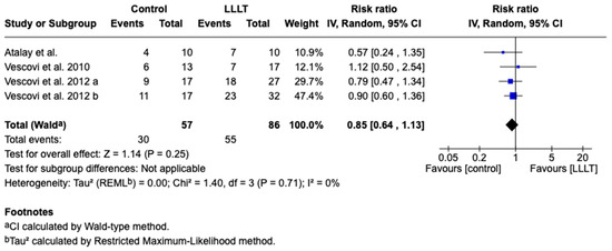 The meta-analysis was conducted by a random-effect model because of the low heterogeneity (I2 = 0%) among the four included studies that compared the treatment of BRONJ with LLLT and with surgery. The overall effect, reported in the forest plot (Figure 3), revealed that there is insufficient evidence to declare a statistically significant difference between LLLT and comparator treatments (RR 0.84 95% CI: 0.63–1.13; Z = 1.16; p = 0.25).