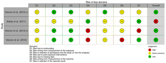 Bias assessment evaluated by ROBINS-E [54,55,56,57]. The most important section to evaluate is D6, reflecting the fact that different measurements were made regarding the control groups, and therefore, this result is reflected in this way.