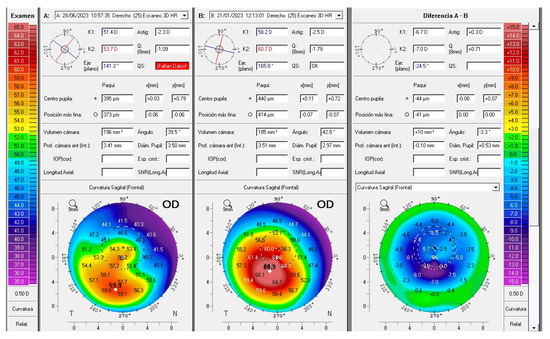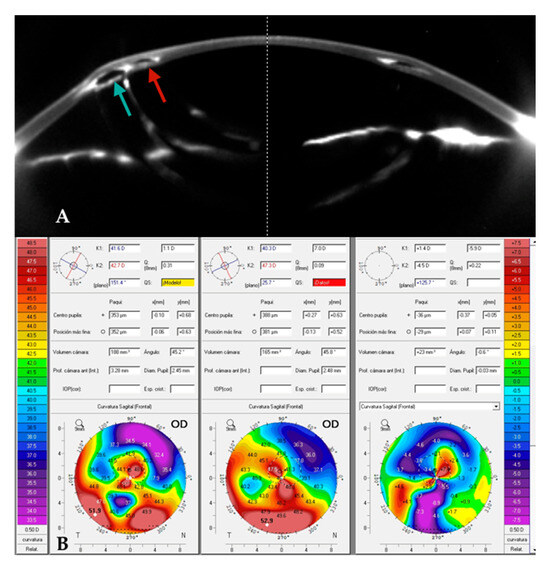 (A). A 320° AJL® intracorneal ring segment (ICRS) (red arrow) was implanted in a patient with a pre-existing INTACS® ICRS (green arrow), without requiring explantation of the latter. (B). Comparative axial maps: preoperative (left), postoperative (center), differential (right). Up to approximately 9 D of inferior flattening is observed, as is a decrease of almost 6 D in the keratometric cylinder. The patient’s CDVA improved from 0.5 to 0.8 (Decimal).