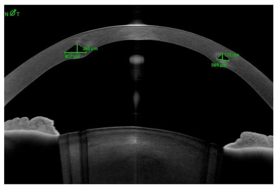 Anterior segment OCT displaying a cross-sectional image of an asymmetric ICRS, with the nasal portion of the segment appearing wider and thicker than the temporal portion.